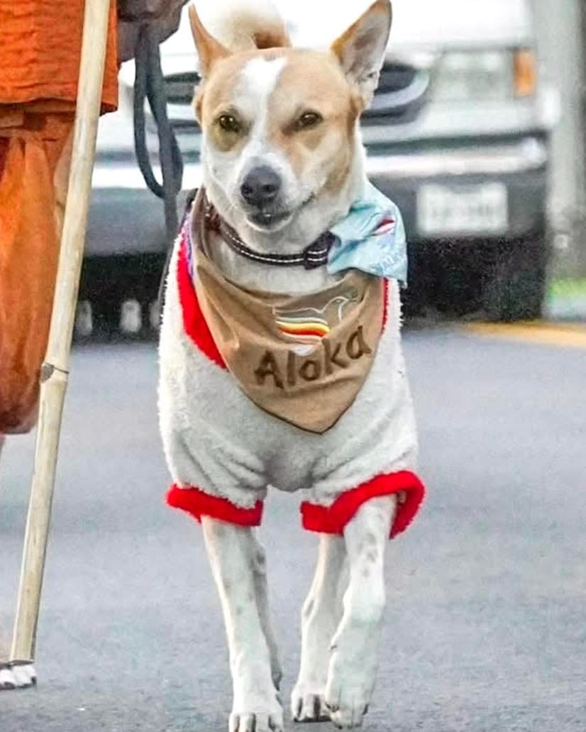 According to the monks, Aloka is about 4 years old and is likely an Indian Pariah dog. Each morning, people along the road see him calmly walking beside them. Sometimes he wears a scarf that reads "Aloka." And other times it says "Walk for Peace."