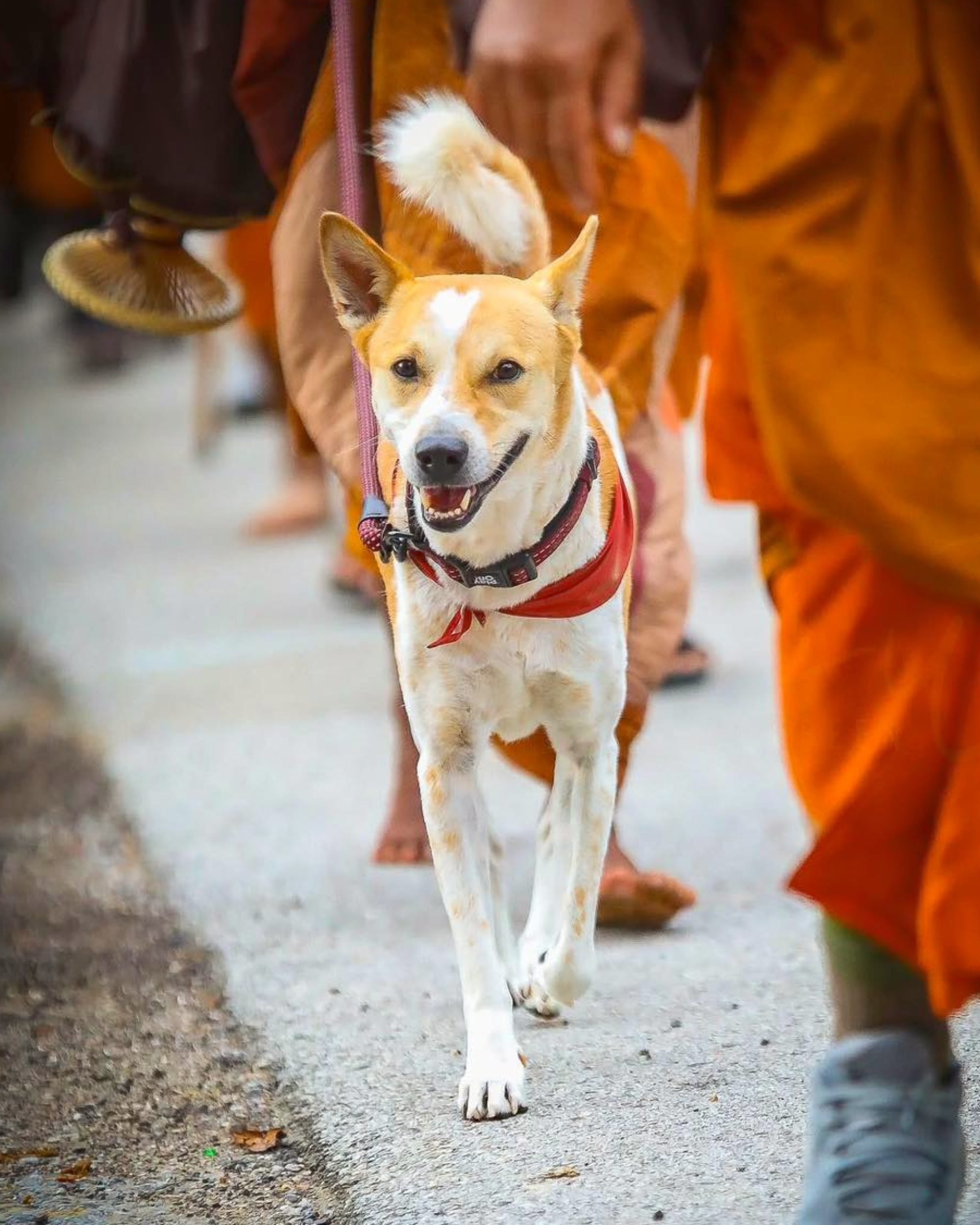 In videos posted to social media, Aloka can be seen running around as the monks walk. Some people pet him, and others give him dog treats or toys.
